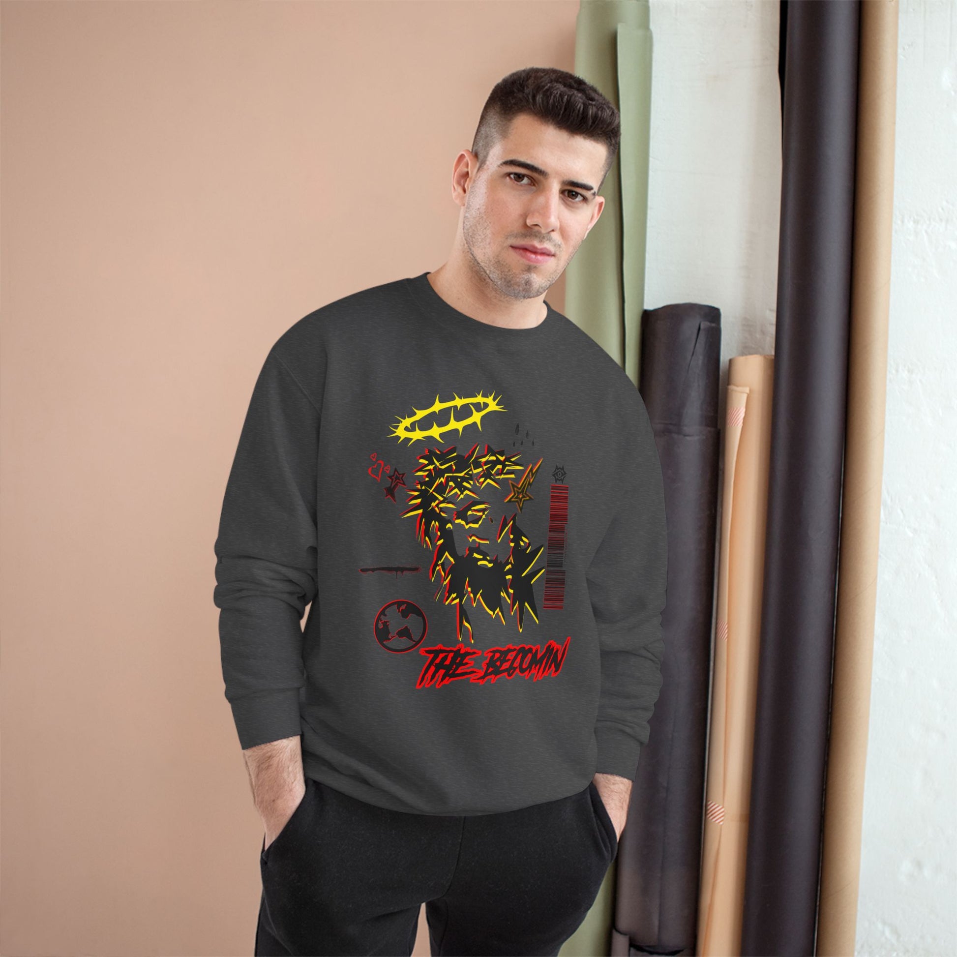 This medium-weight crew sweatshirt brings a relaxed, streetwise energy to everyday wear. The front features layered graphic elements—sketch-like faces, a globe motif, barcode and emblem details—while the back carries a bold, hand-drawn logotype and small accent graphics. It feels like a piece of wearable zine art: rough edges, deliberate marks, and an urban DIY attitude. Warm enough for cool evenings, it sits comfortably in a regular fit and wears in with a lived-in character over time. Slip it on for late-night city walks, creative meet-ups, or when you want an effortless layer that reads like your sketchbook come alive.