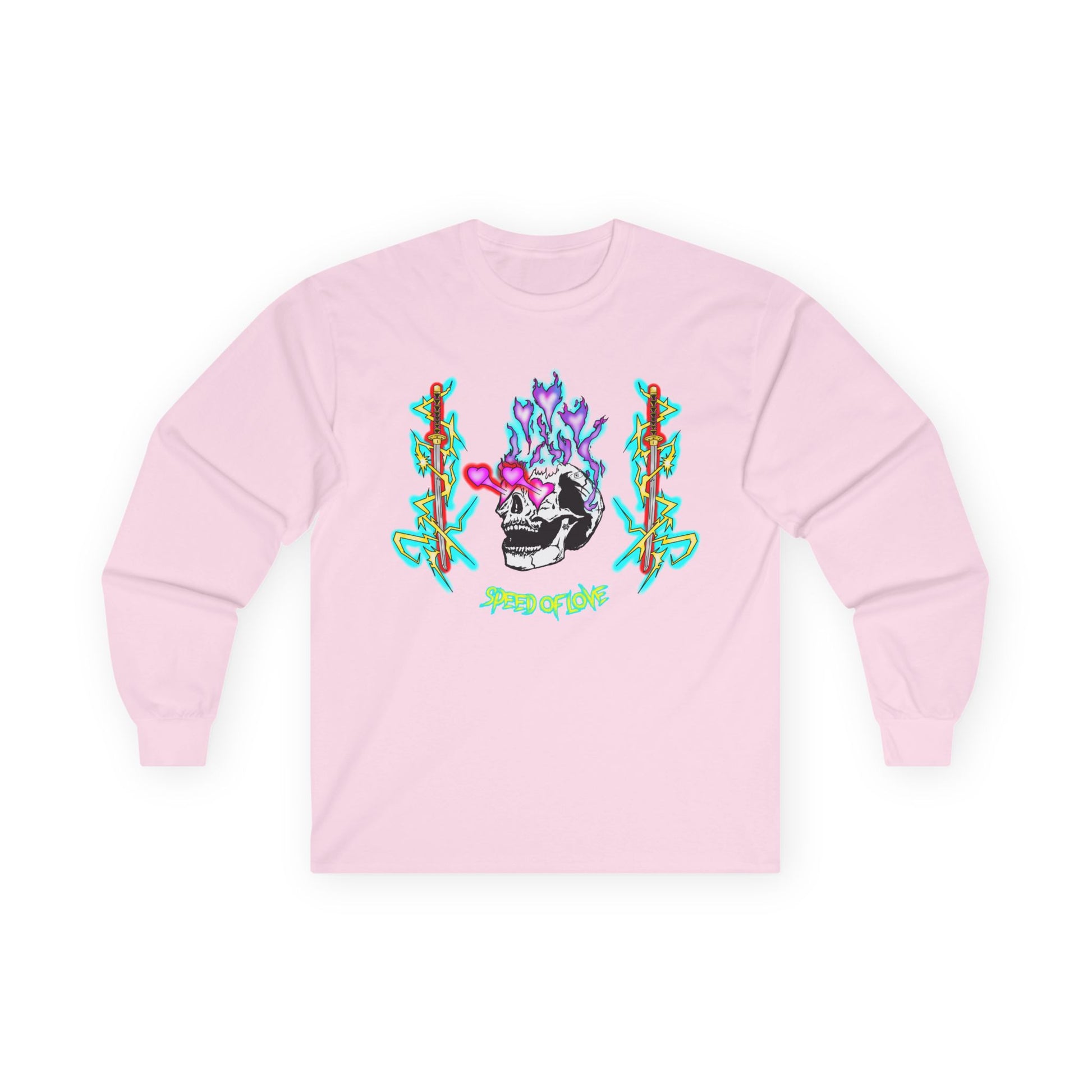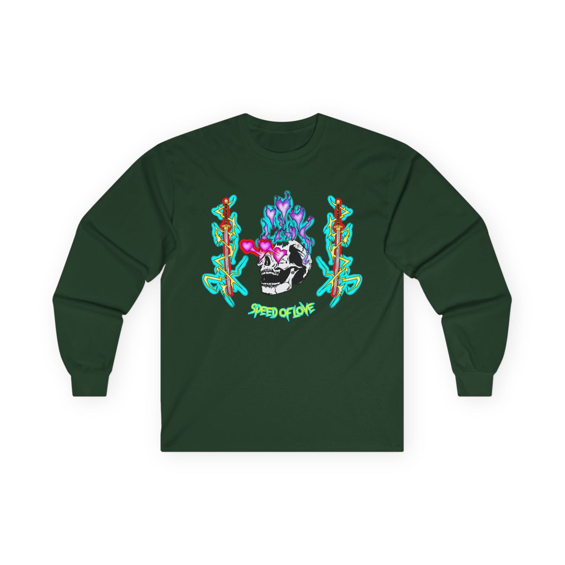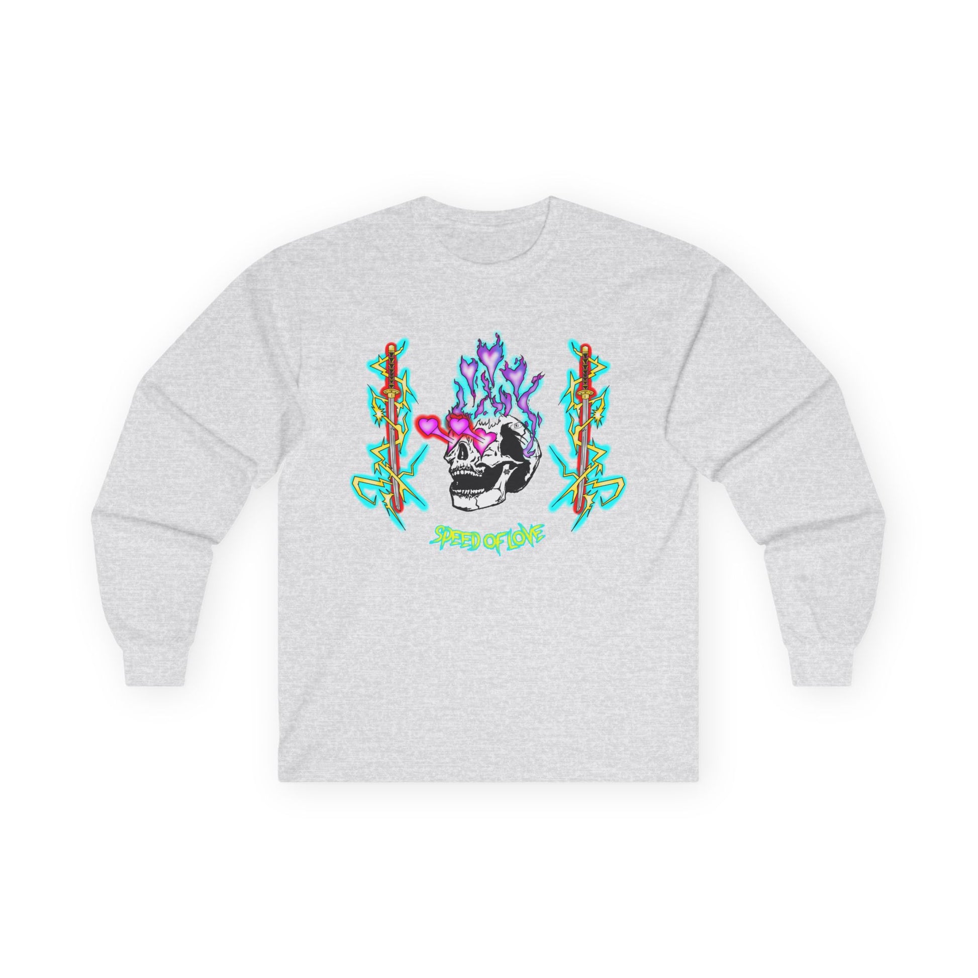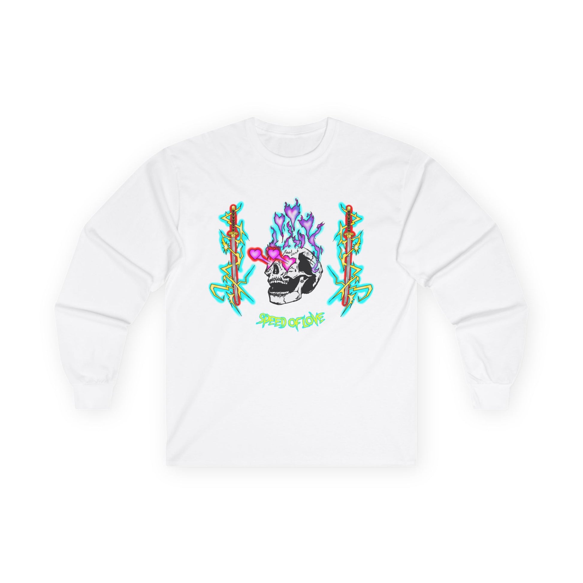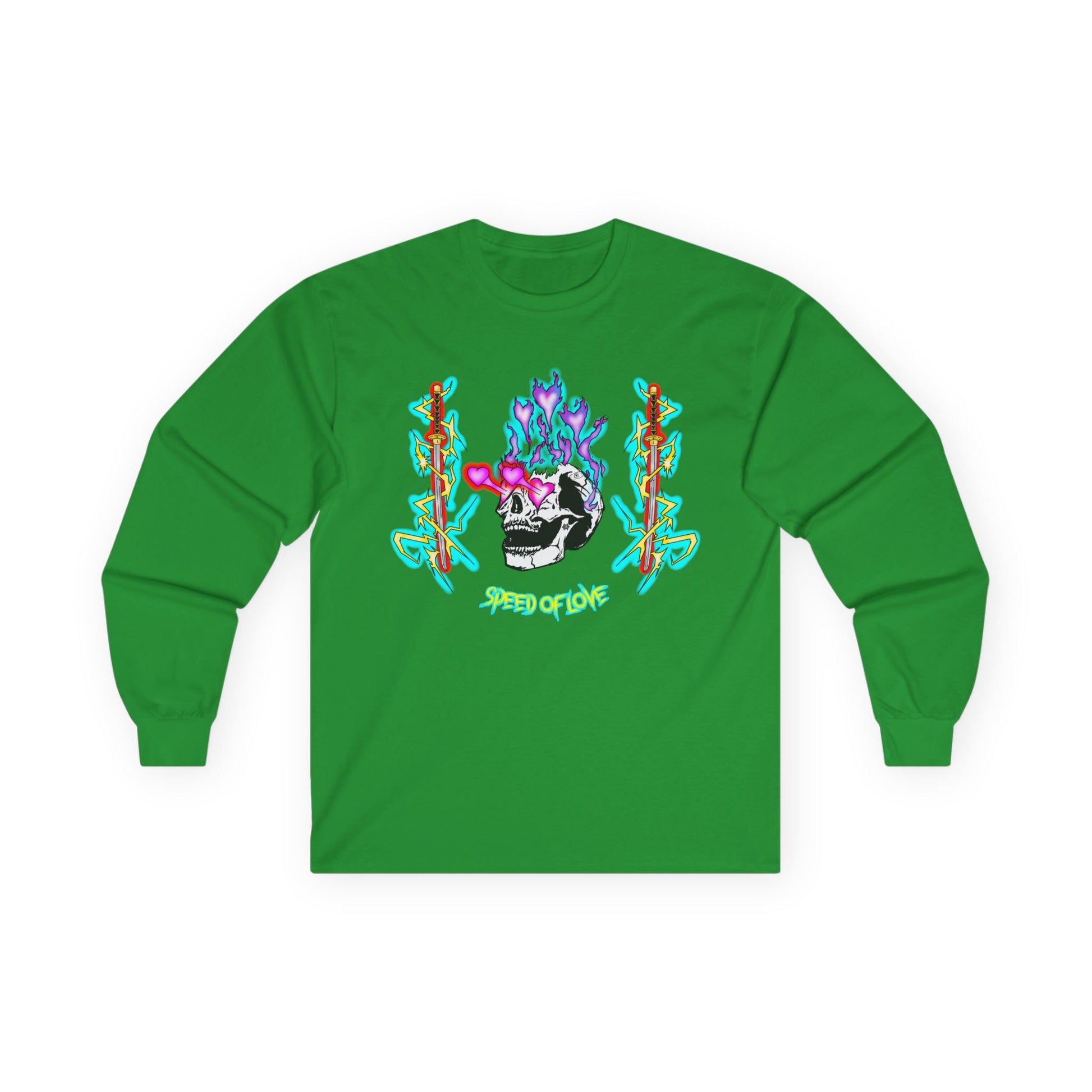 The Long Sleeve Tee Speed Of Love is a cozy and stylish addition to your wardrobe, perfect for those who love a vintage feel. It is great for casual wear or lounging at home, offering a comfortable and relaxed vibe. This tee is ideal for adults looking for a unique and eco-friendly piece to wear during the colder months, and it's perfect for Valentine's Day and anniversaries.