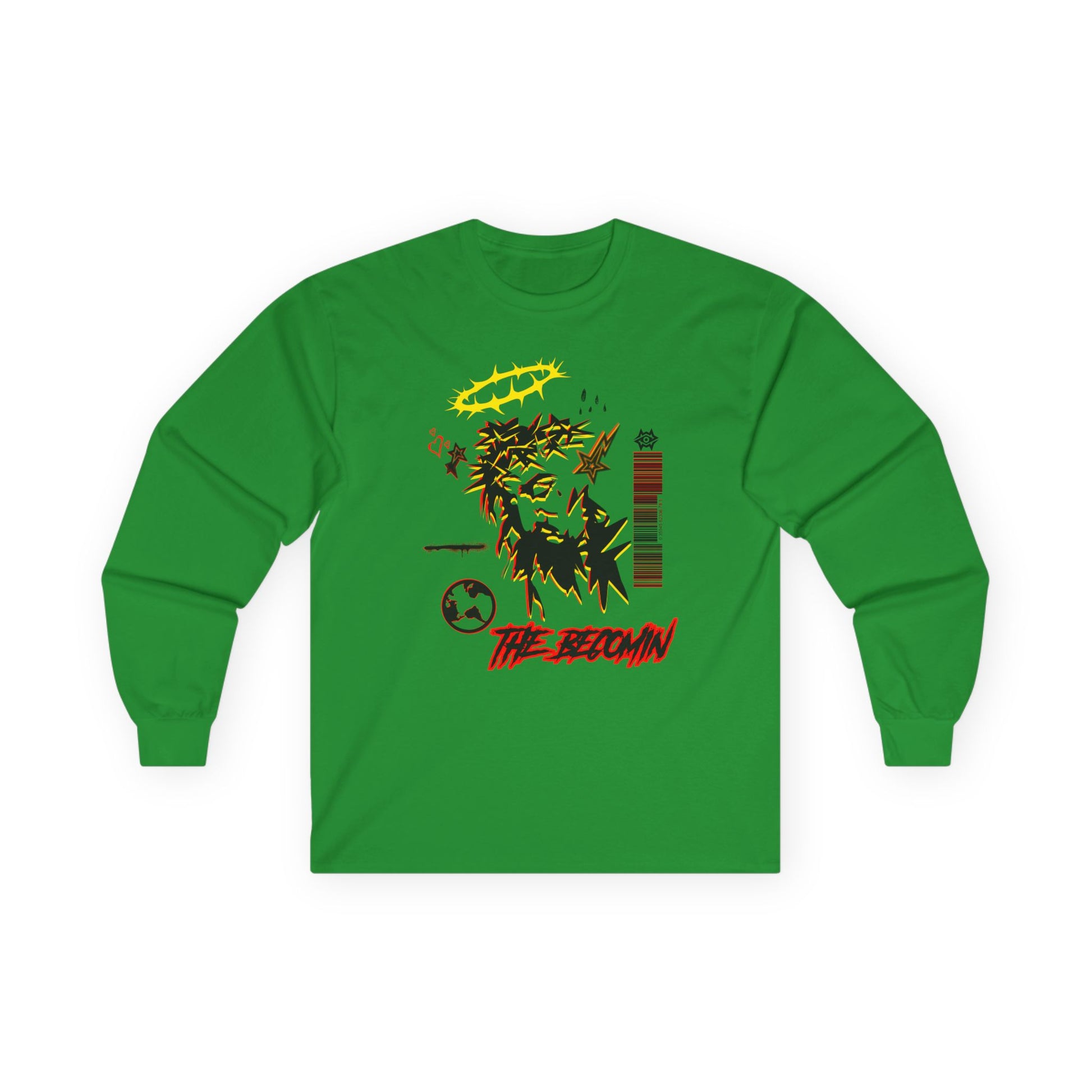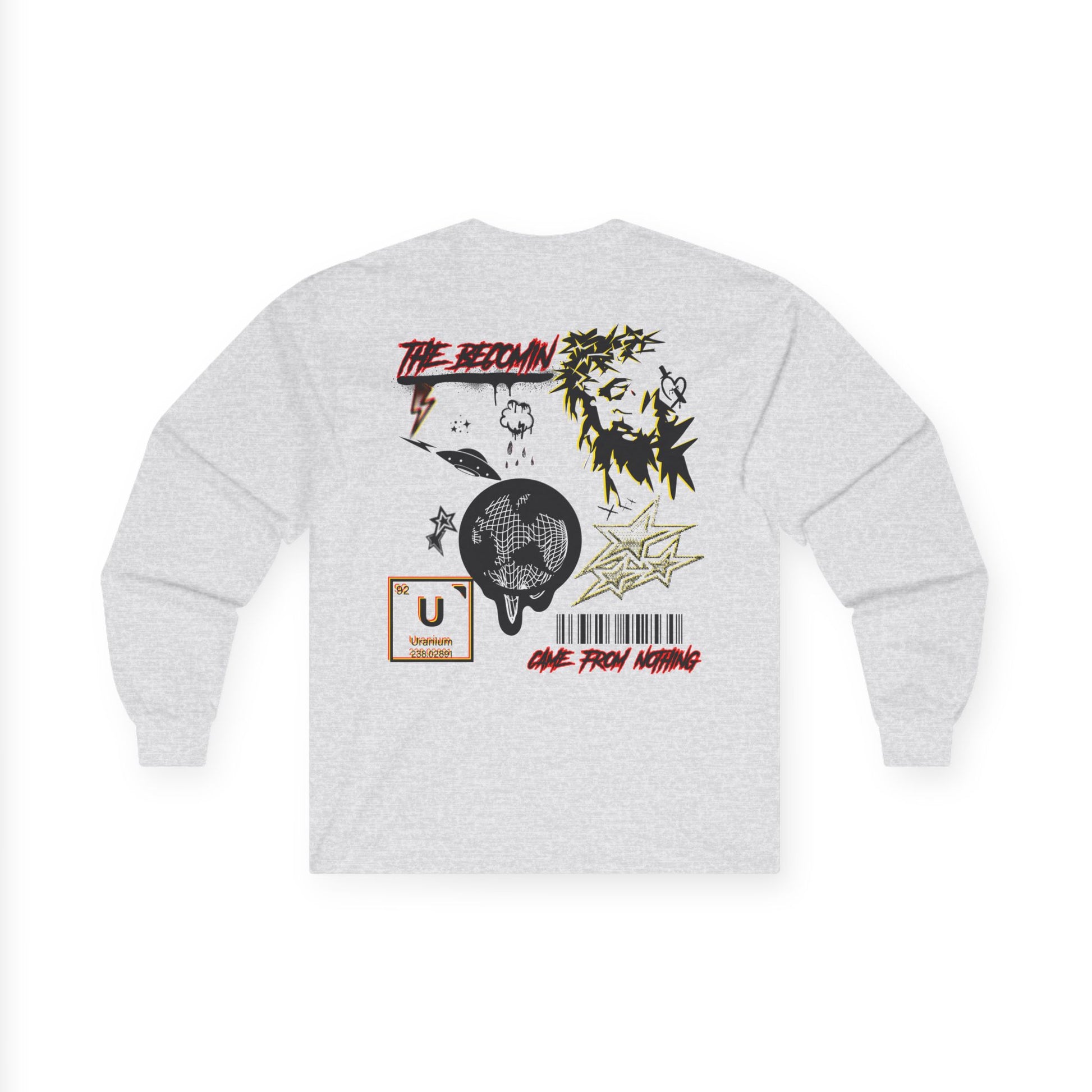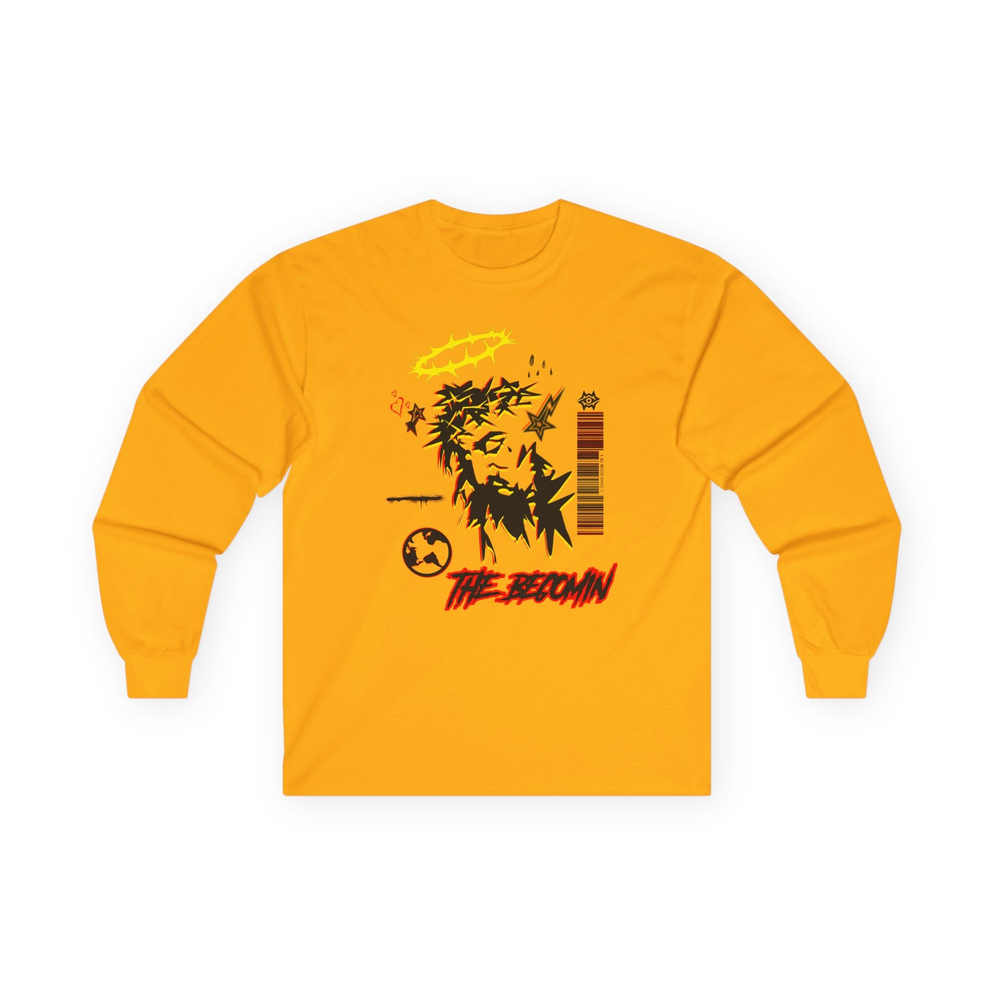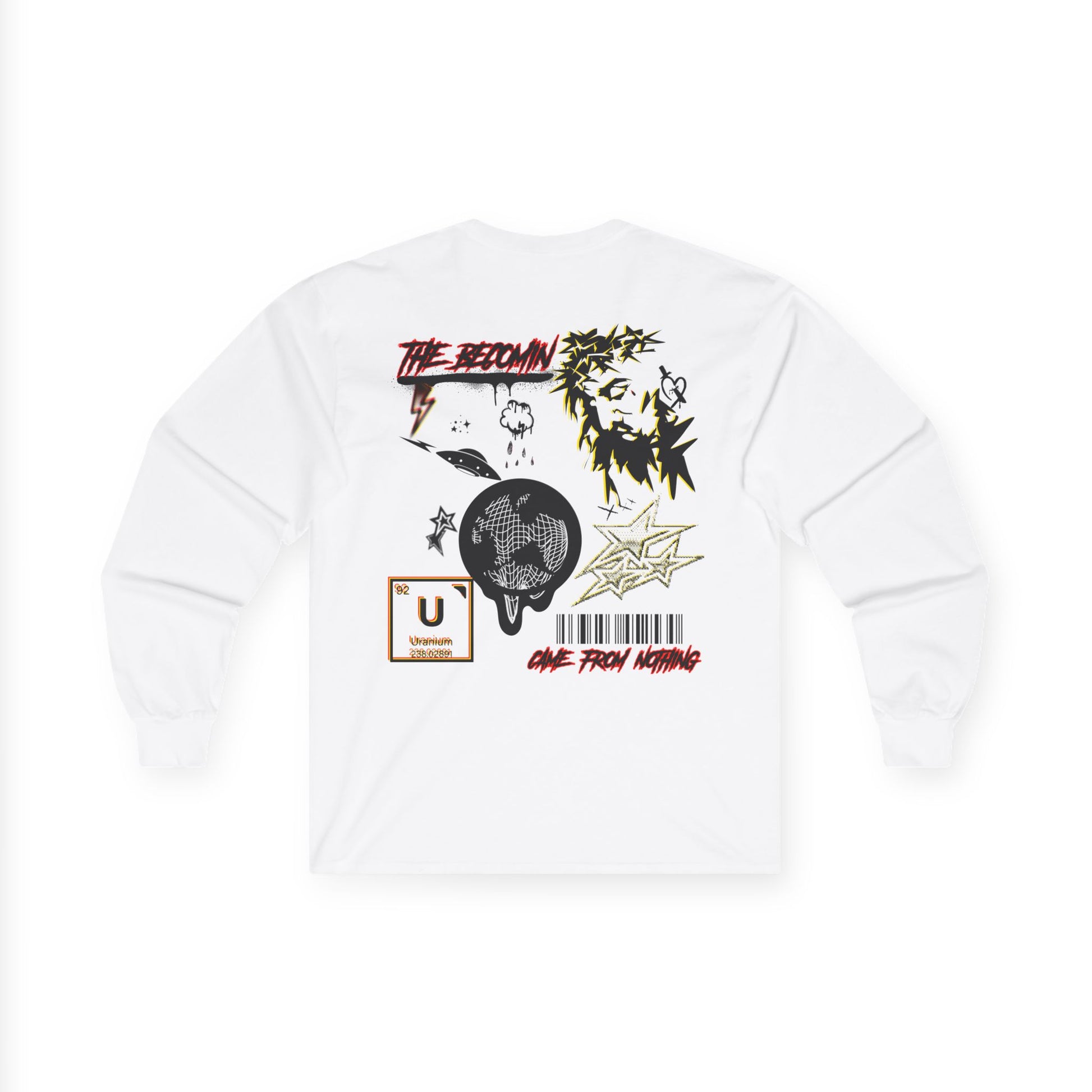 Our new long-sleeve tee World Drip carries a raw, street-art energy—gritty ink sketches, barcode markings, and a haloed figure that feels both rebellious and reflective. The medium-weight cotton gives it a vintage, lived-in look and the tubular knit keeps the silhouette clean. Wear it to layer under a jacket or on its own when you want your wardrobe to speak with grit and subtle symbolism. It’s for nights at DIY shows, late-night drives, or leaning against a city wall watching the world move. The artwork reads like a mixtape cover: fractured, bold, and quietly honest.