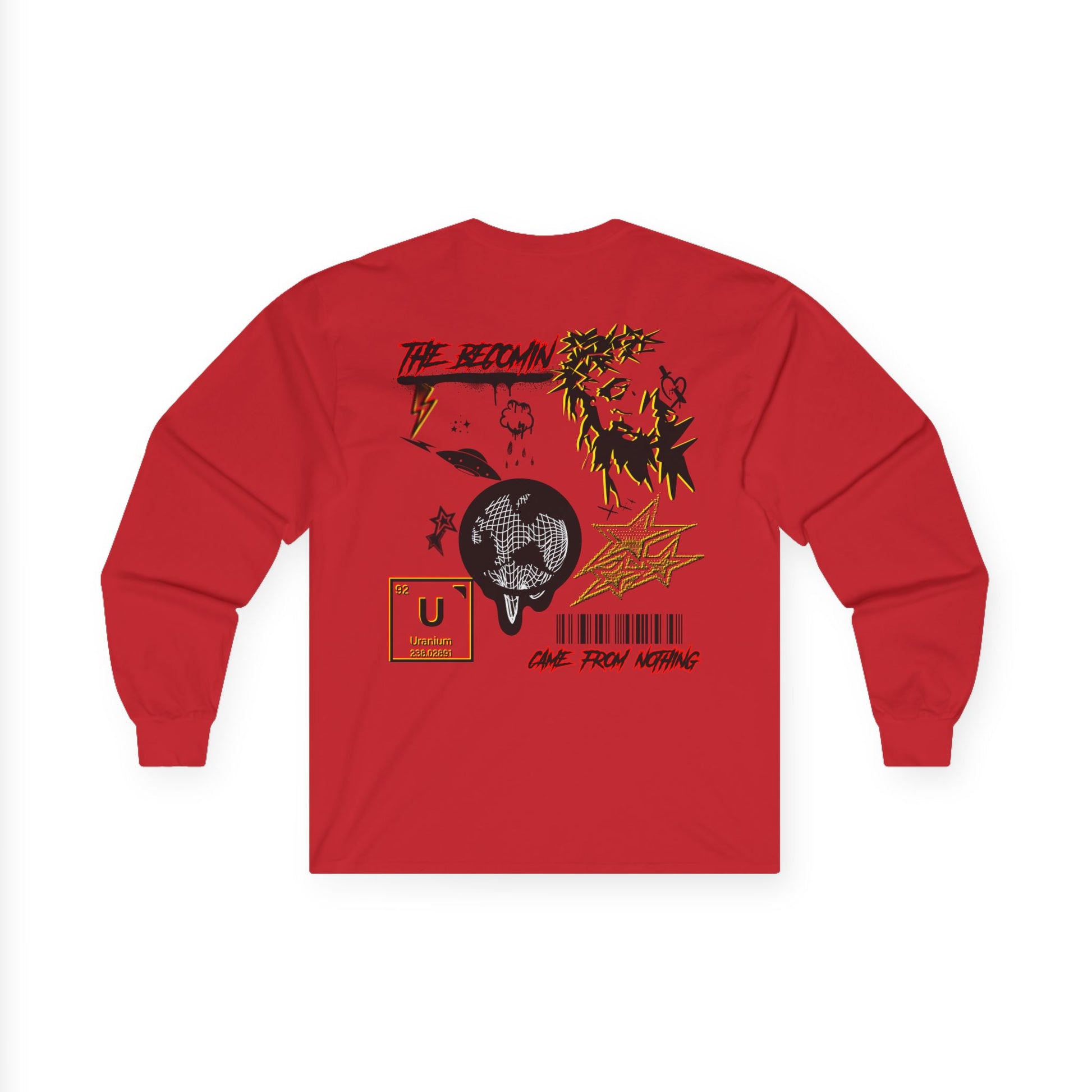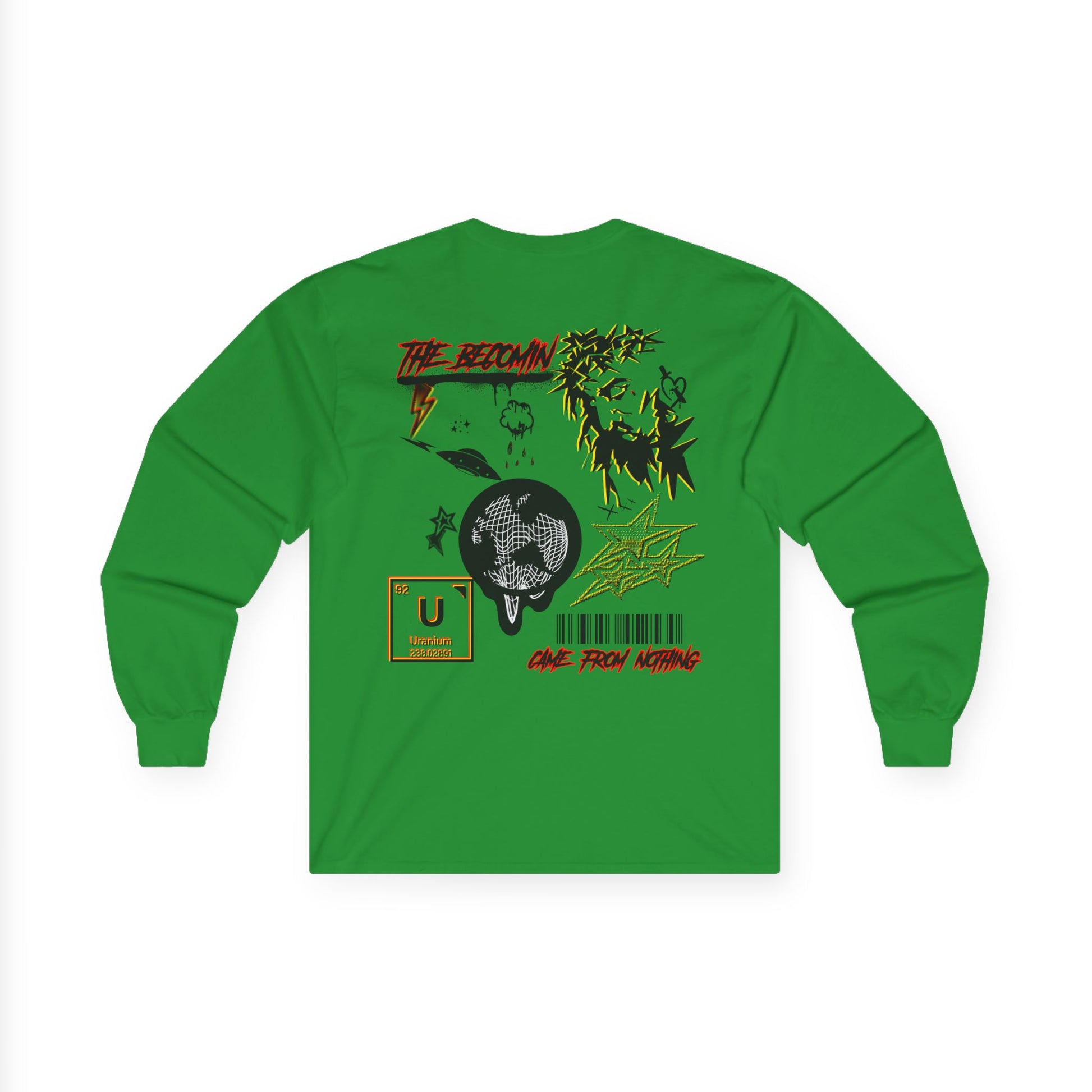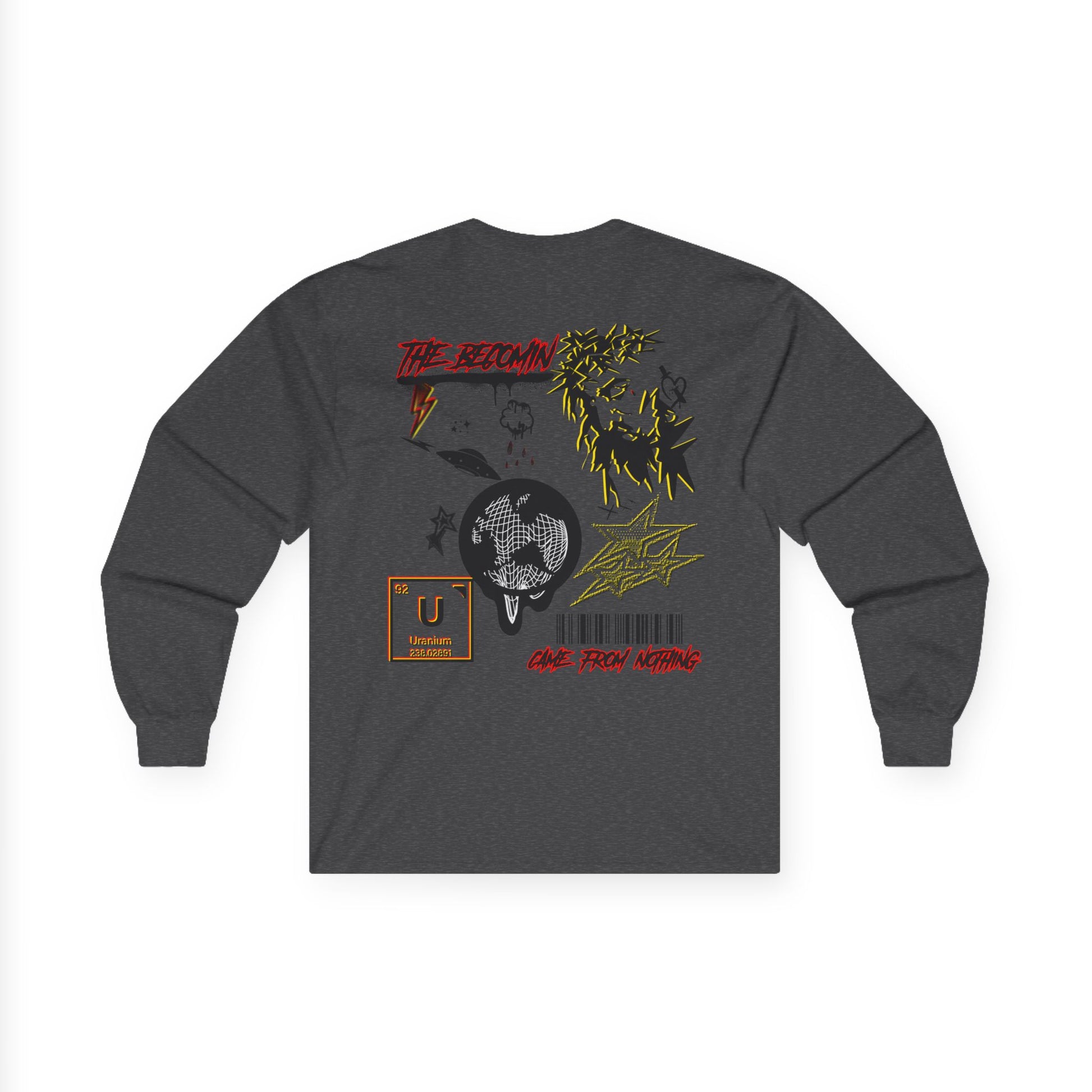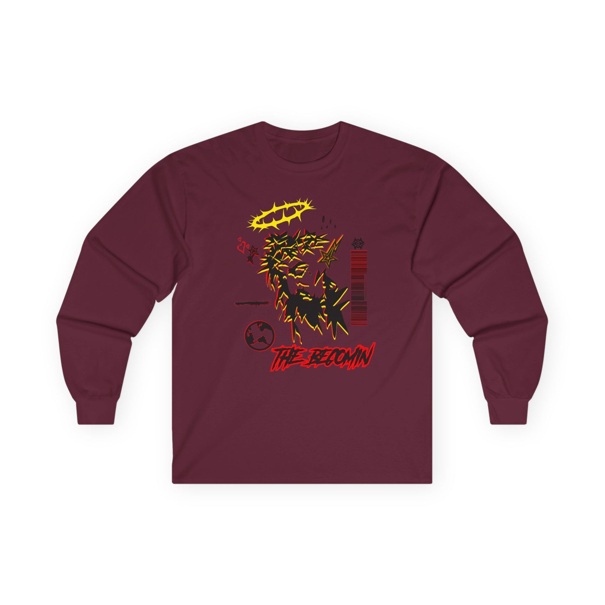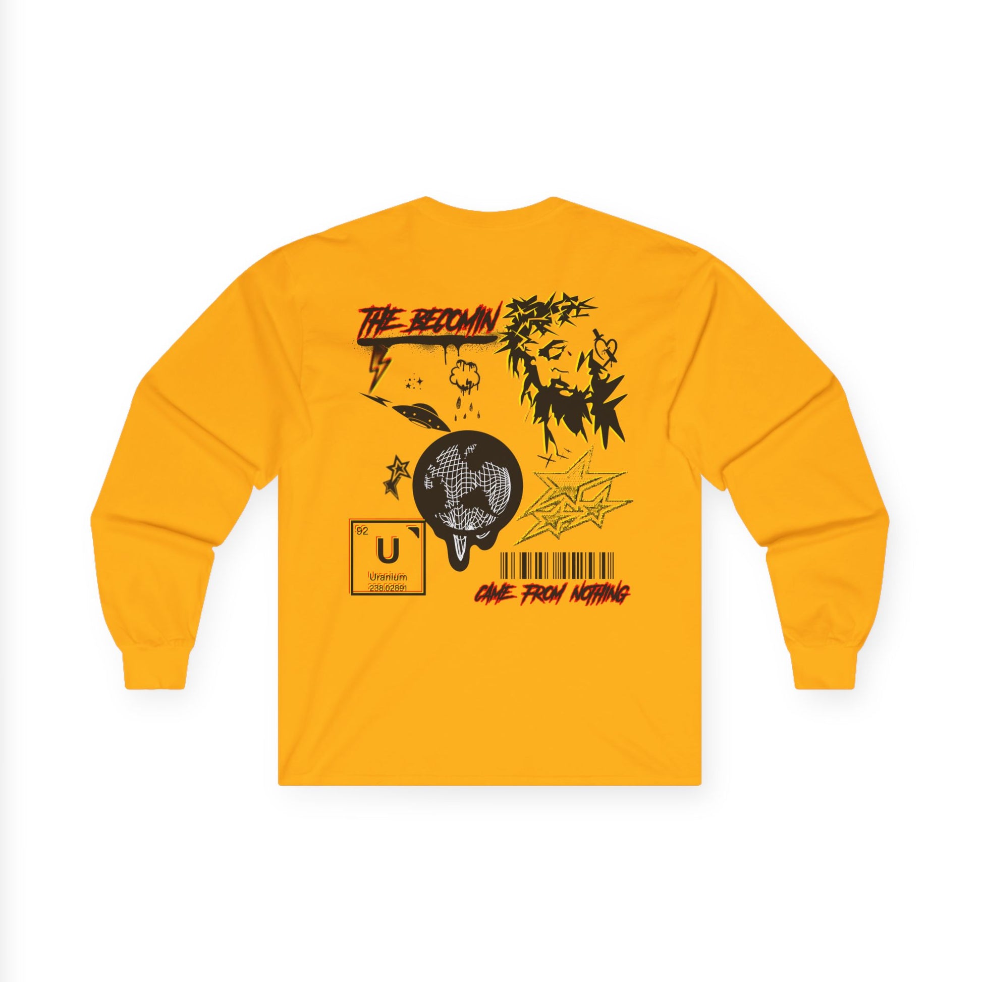 Our new long-sleeve tee World Drip carries a raw, street-art energy—gritty ink sketches, barcode markings, and a haloed figure that feels both rebellious and reflective. The medium-weight cotton gives it a vintage, lived-in look and the tubular knit keeps the silhouette clean. Wear it to layer under a jacket or on its own when you want your wardrobe to speak with grit and subtle symbolism. It’s for nights at DIY shows, late-night drives, or leaning against a city wall watching the world move. The artwork reads like a mixtape cover: fractured, bold, and quietly honest.