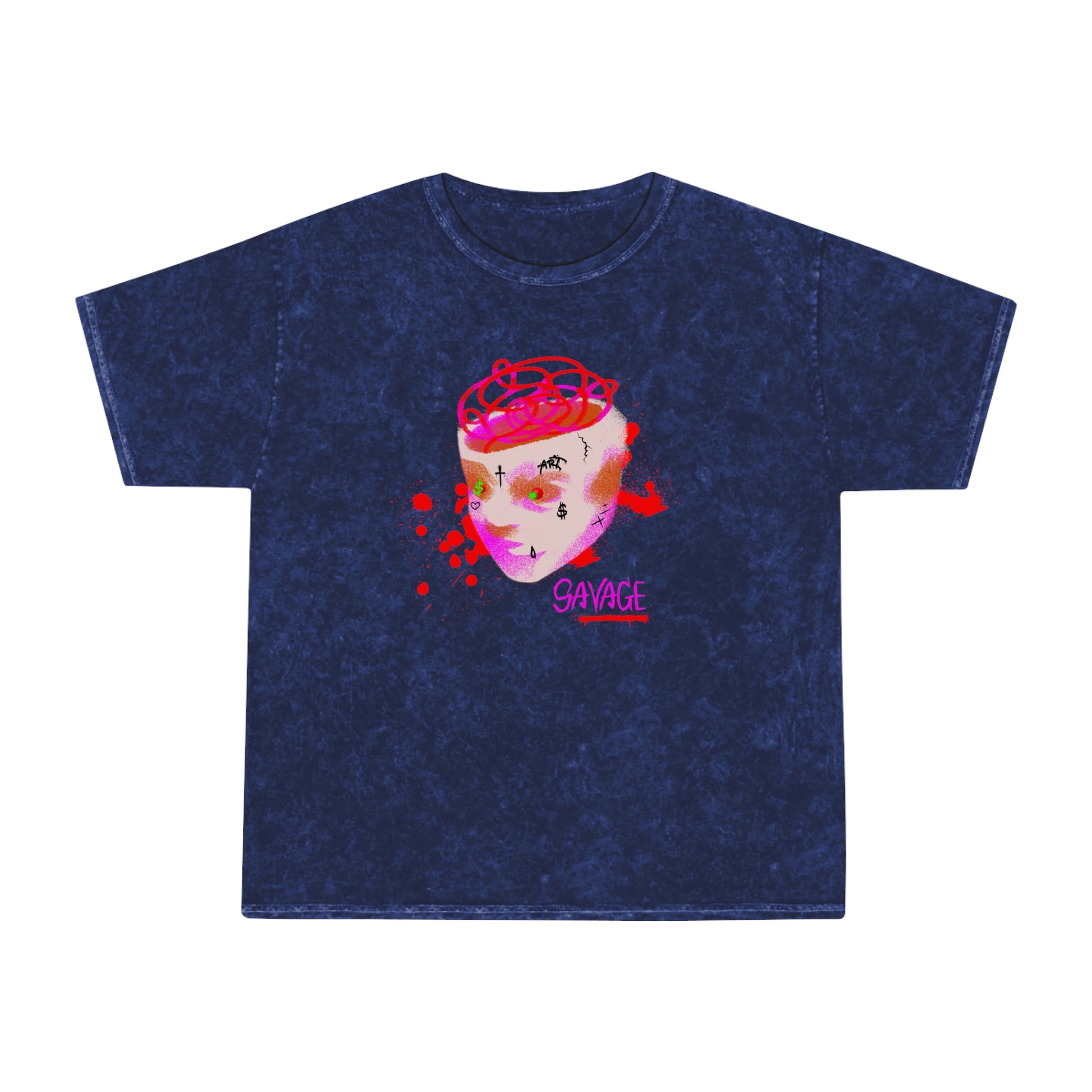 This mineral-wash tee carries an art-studio energy — soft, worn-in gray with a painterly, surreal face printed on the chest in neon pinks and warm reds. It feels lived-in from the first wear: lightweight cotton that breathes, a relaxed regular cut that layers easily, and a vintage-marble wash that lets the artwork sit like a small, rebellious portrait. Wear it to a late-night gallery crawl, a coffee-shop sketch session, or when you want your outfit to read like a personal manifesto. The hand-dyed finish means every shirt has its own subtle variations, so yours will be uniquely you — a little faded, a little raw, and entirely expressive.