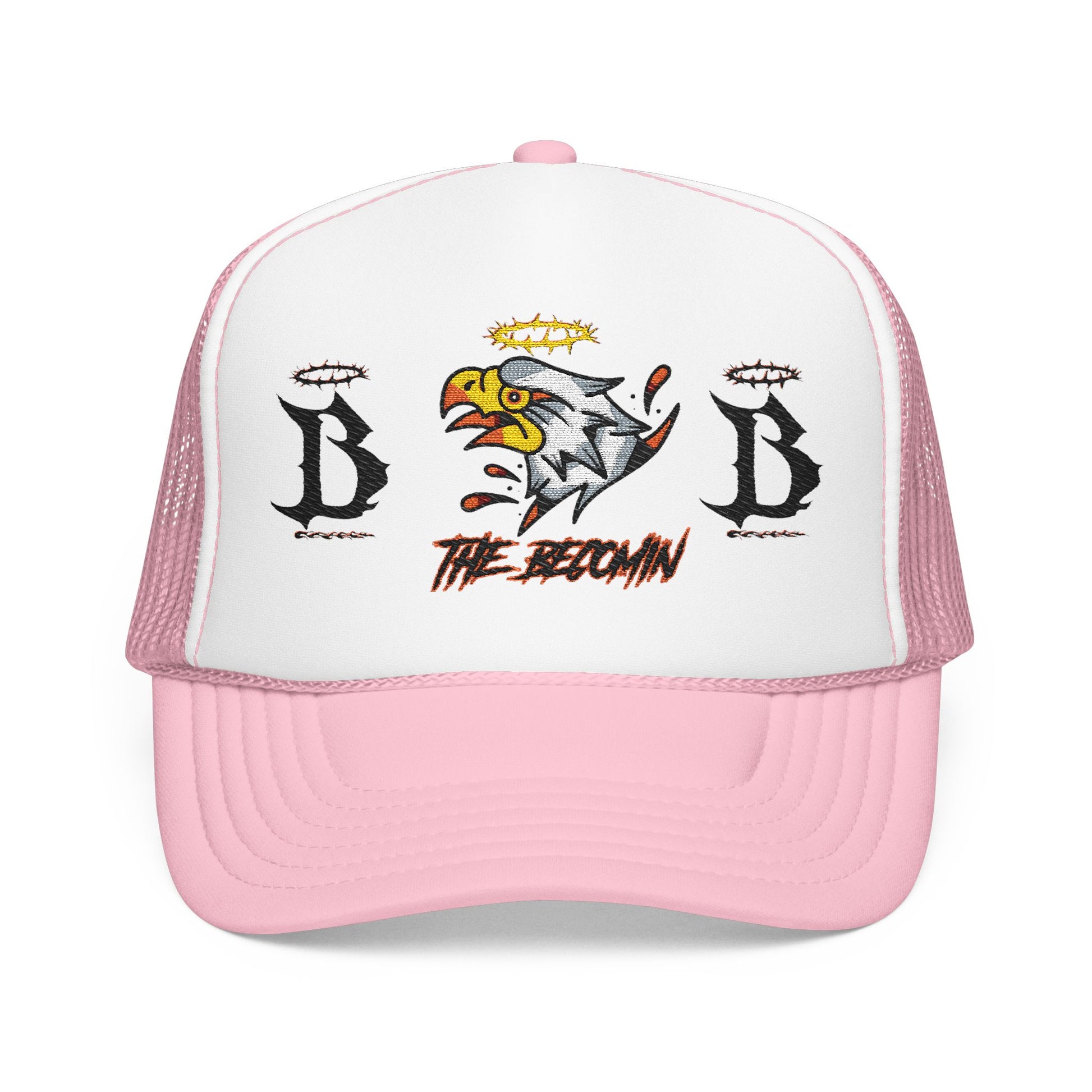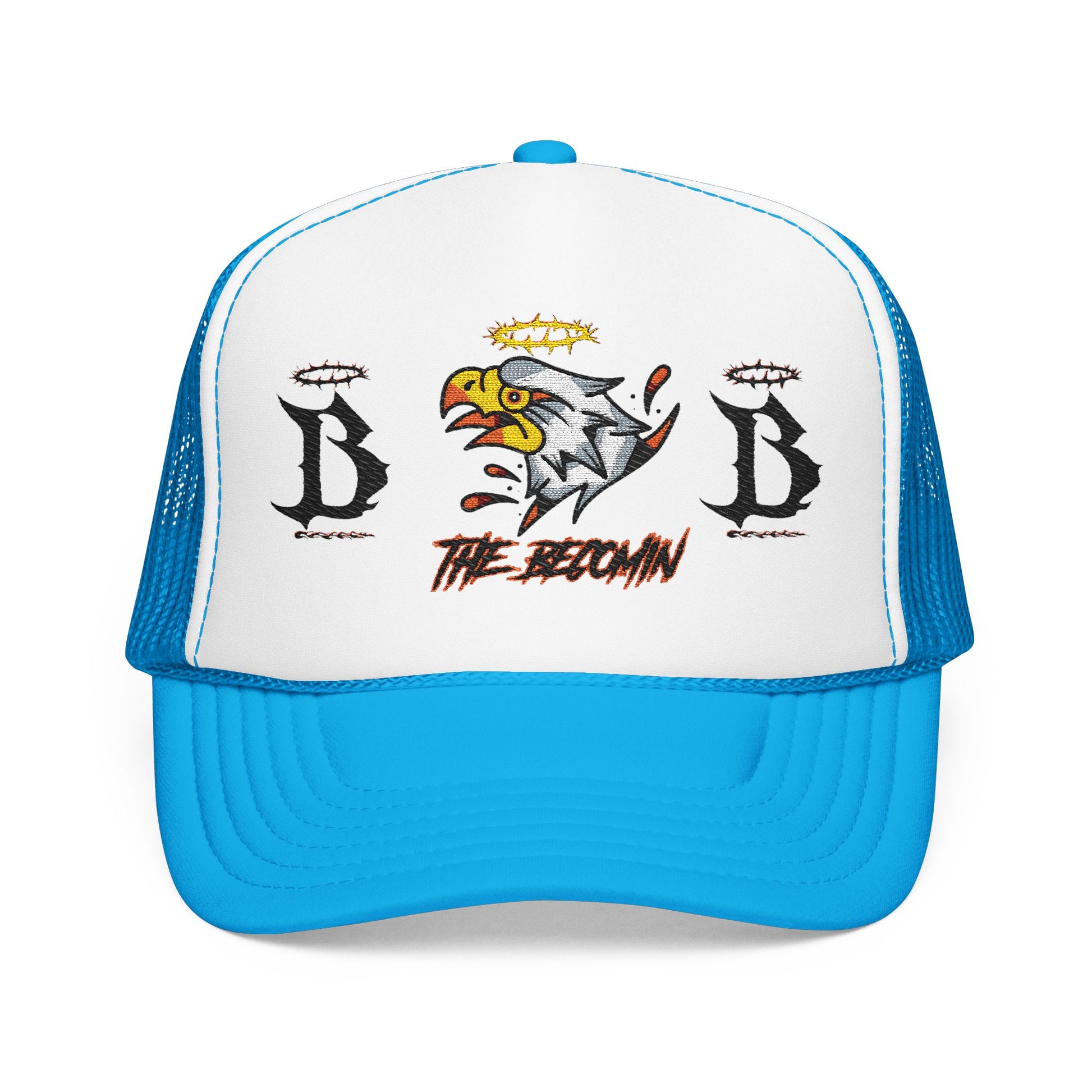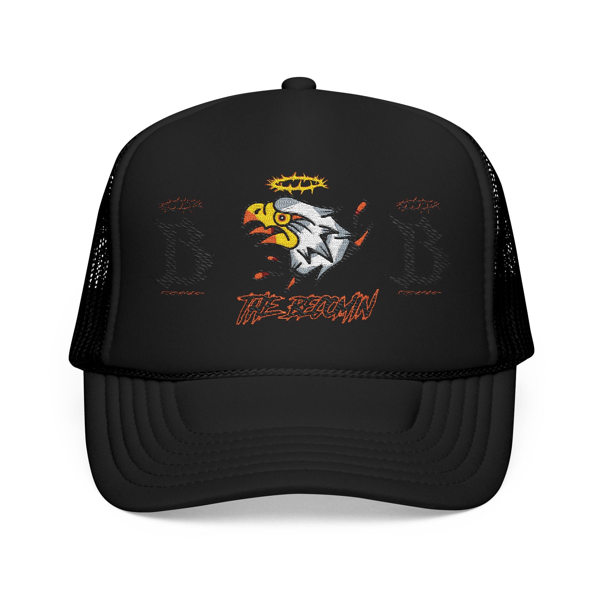 This structured foam trucker cap brings bold street energy with vintage grit. A high-profile, seamless foam front carries a fierce embroidered eagle motif flanked by distressed letter marks and subtle halo accents — a look that reads like worn-in band merch or a road-trip souvenir. The mesh back keeps the cap breathable while the laminated foam front holds its shape; the pre-curved visor and matching undervisor create a unified, finished appearance. Wear it tilted back on a sun-soaked afternoon, paired with a denim jacket and boots, or let it cut through bright stadium lights during late-night drives. It’s for someone who likes lived-in style that still stands tall and announces itself without shouting.